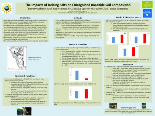 Soil dendrochemistry, or the elemental analysis of dated soil samples, has been used to monitor historical changes in soil and atmospheric chemistry, soil development, and land-use history. For restoration ecologists, however, this approach also provides a way to detect the long-term changes in environmental quality since variations in soil chemistry typically coincide with changes in plant tissue chemistry. The goal of this study is to compare the chemical properties of soil samples collected over summer 2016 with those collected 10 years ago after the construction of the berm at the Chicago Botanic Garden, and link those to metrics of plant growth.